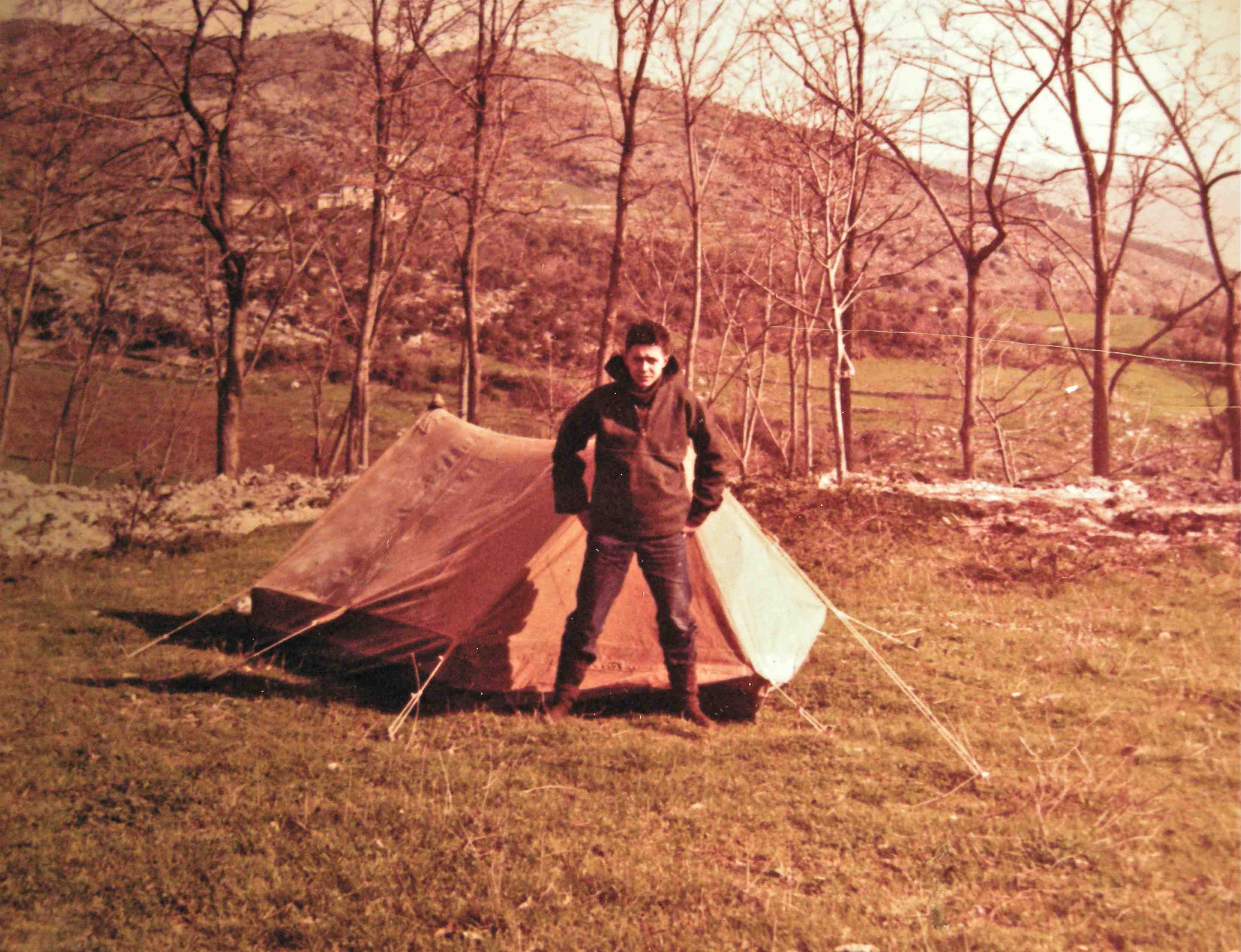 1963, Alberto di Priero vicino alla tenda montata in un prato vicino alla strada che porta al
