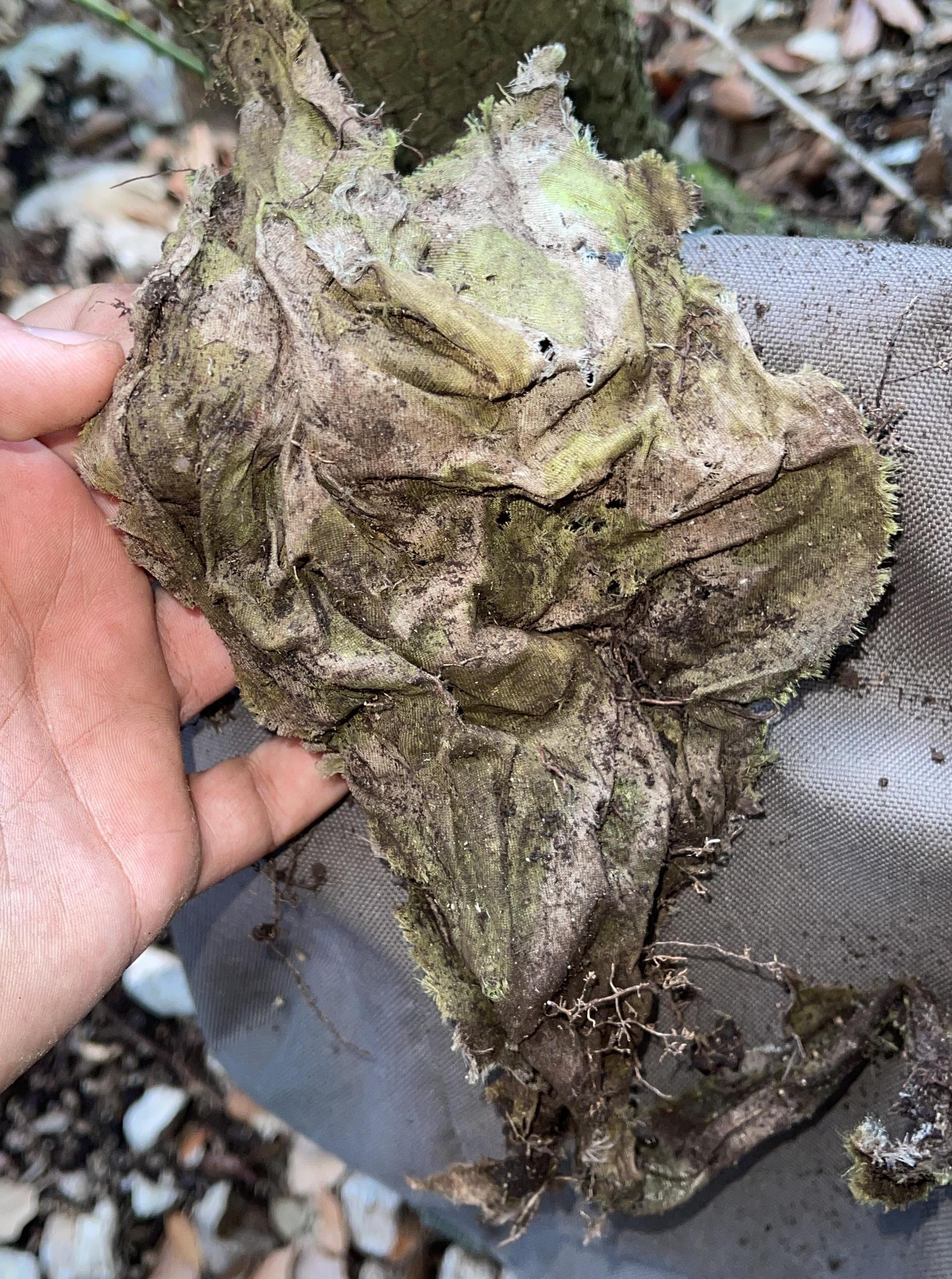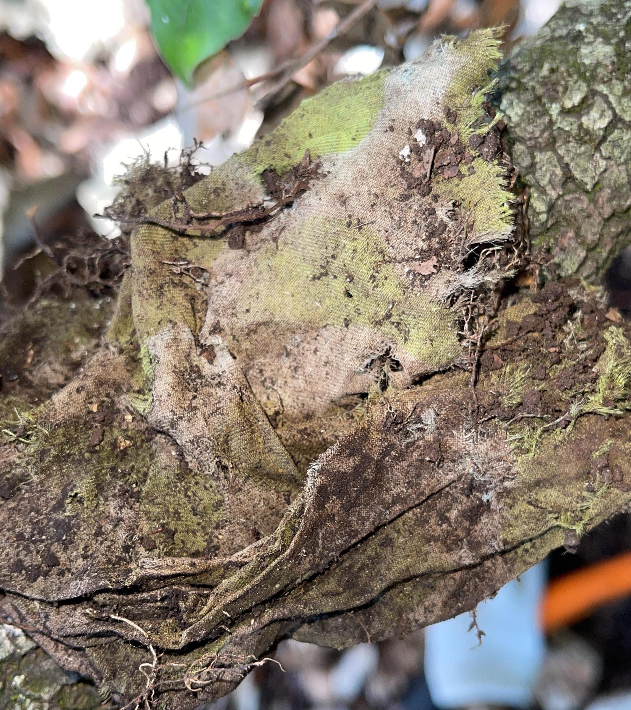 Lo raccolsi e, aggrovigliato ad esso, tra radici e terra, notai uno strano brandello di tessuto. Inizialmente pensai ad un pezzo di telo impermeabile usato dai soldati