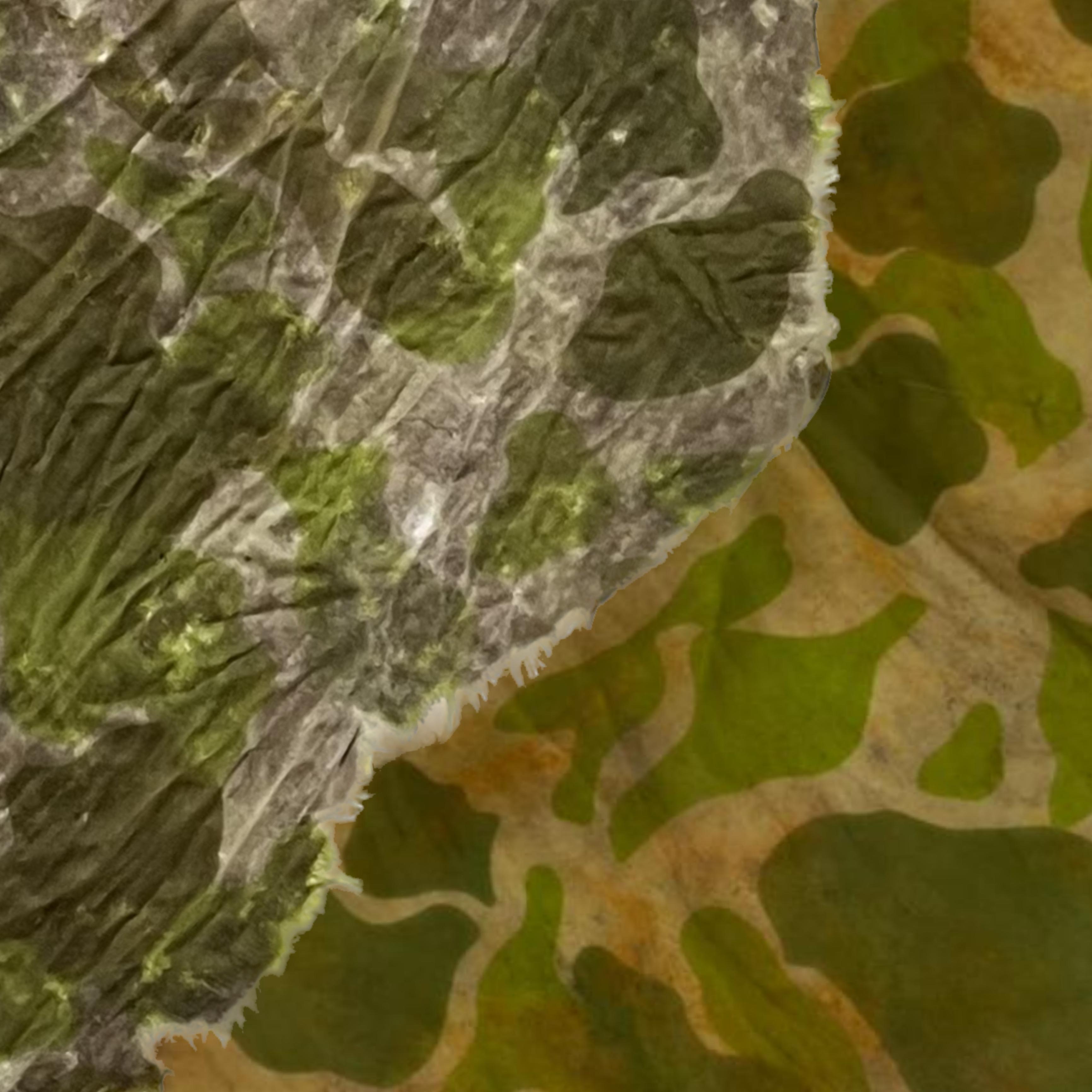 Si tratta certamente di parte di un paracadute perché è in nylon e perché ha un’evidente colorazione mimetica a chiazze verde chiaro, verde scuro e ocra, parzialmente