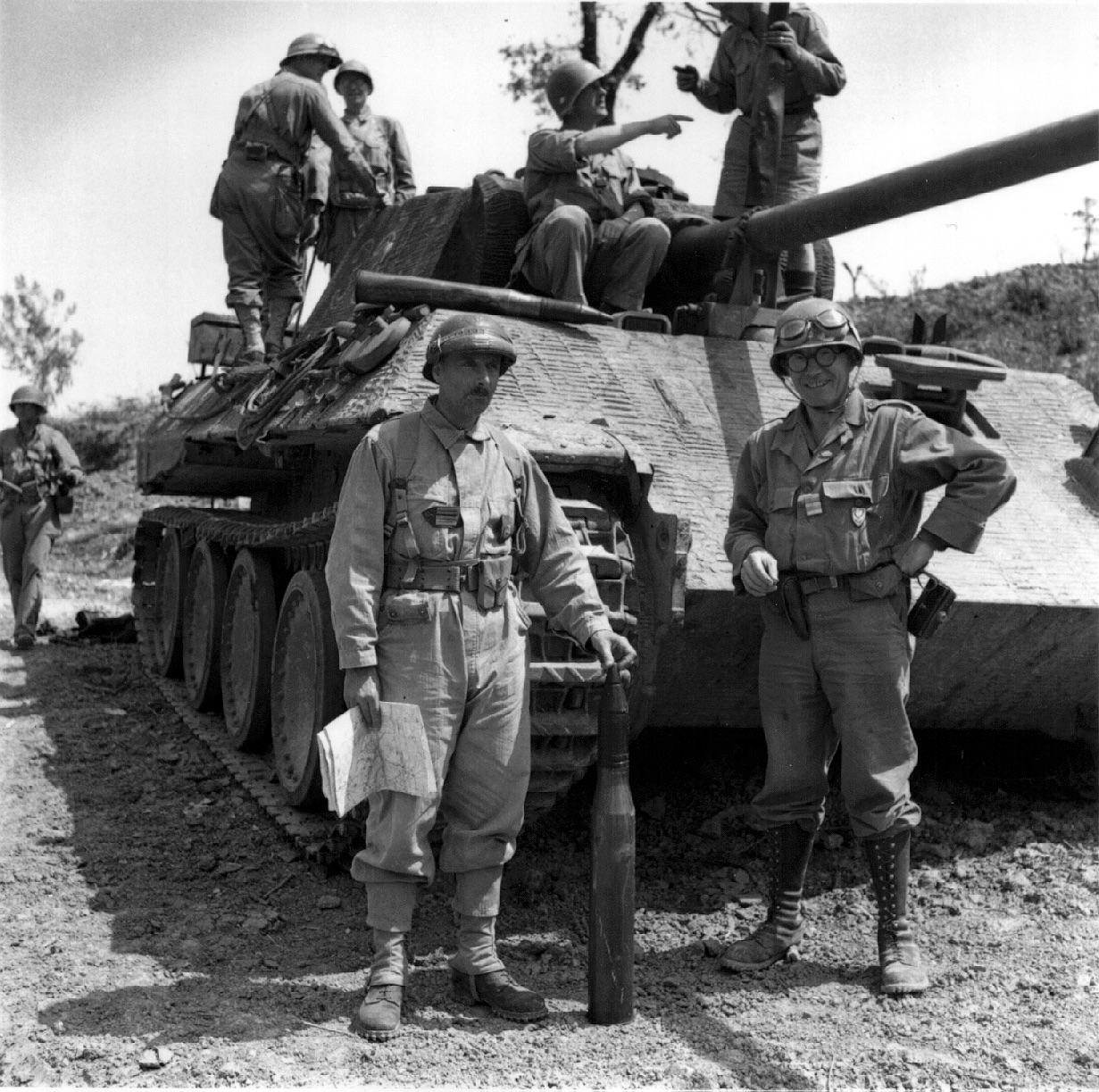 25 Maggio 1944, il colonnello Bonjour, comandante del 3° Spahis algerini, e il tenente colonnello Van Hecke, comandante del 7° Chasseurs d'Afrique, in posa davanti ad un carro "Pantera" distrutto a nord-est di Pico sulla statale 82.