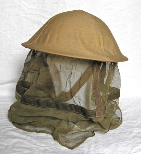 MK I Britih helmet with mosquito net and camo cover.