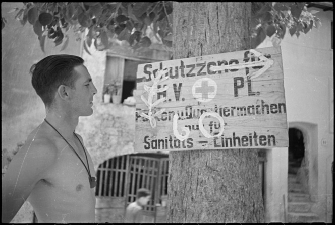 J T Needham (Hamilton) looks at the New Zealand sign, the Silver Fern, superimposed over this German sign near the 6 NZ Field Ambulance's Advanced Dressing Station at Sora in Italy, during World War II. Photograph taken circa 4 June 1944 by George Frederick Kaye.