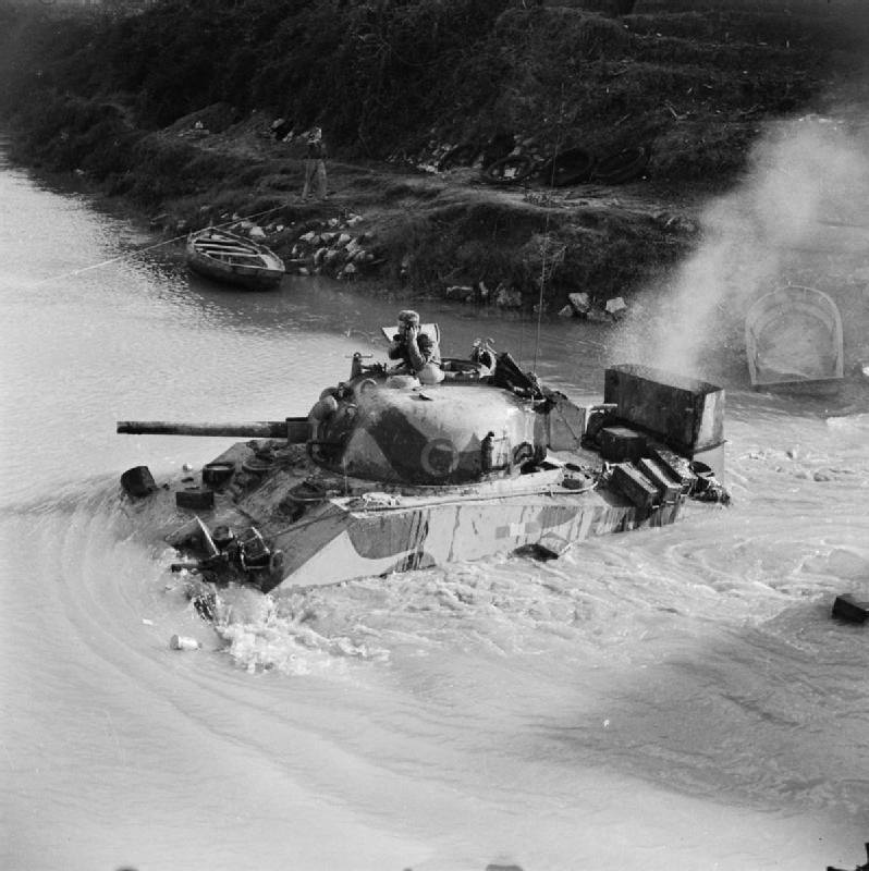 A Sherman tank of the 4th County of London Yeomanry fording the Volturno river at Grazzanise, Italy, 17 October 1943,