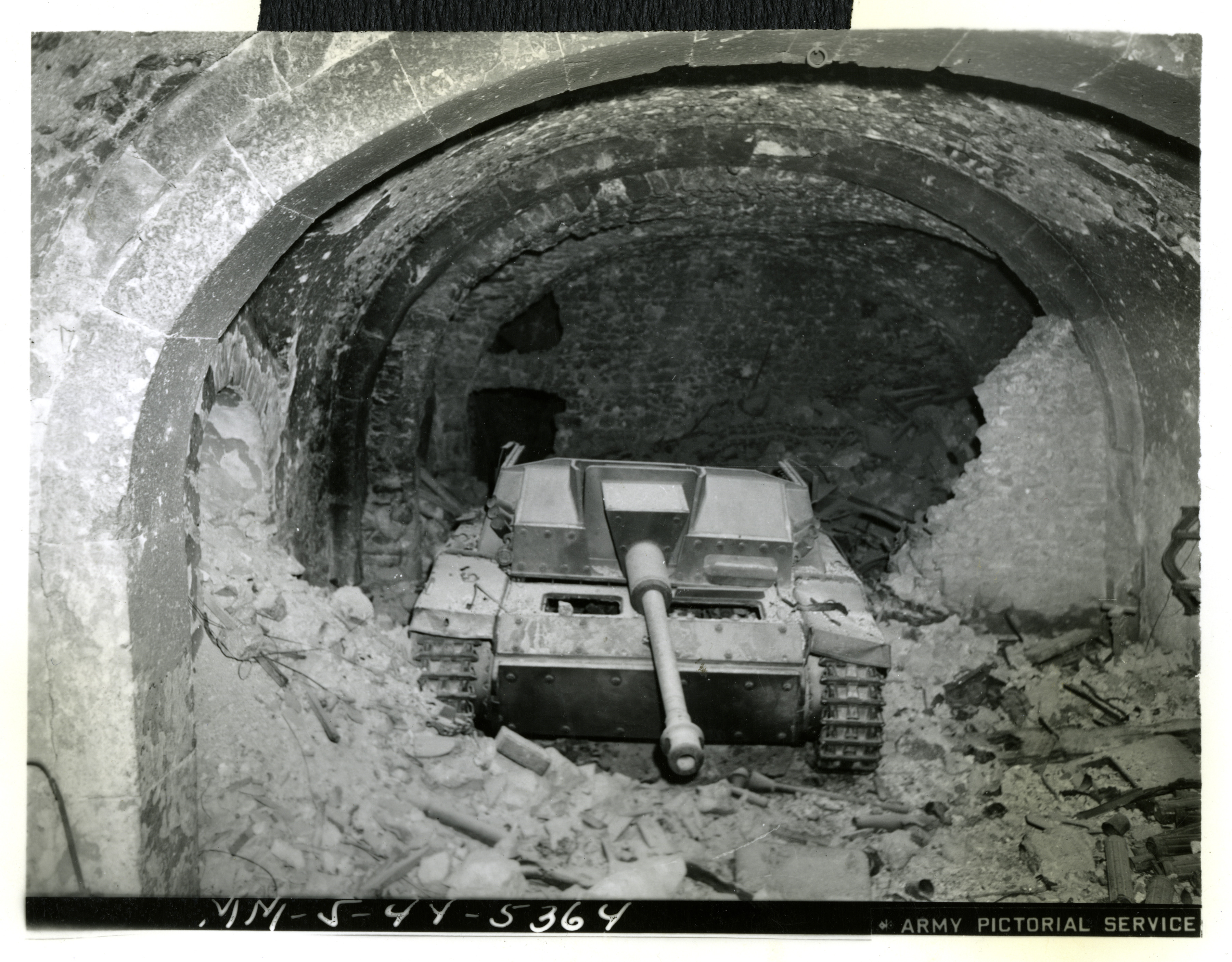 'MM-5-44-5357'; 'This German tank [mounted with a Sturmgeschutz Ausf. F German assault gun] situated in the Continental Hotel, Cassino, stopped many Allied patrols before it was knocked out by the advancing Allies into Cassino, Italy Signal Corps Photo Radioed.' Cassino, Italy. 21 May 1944.